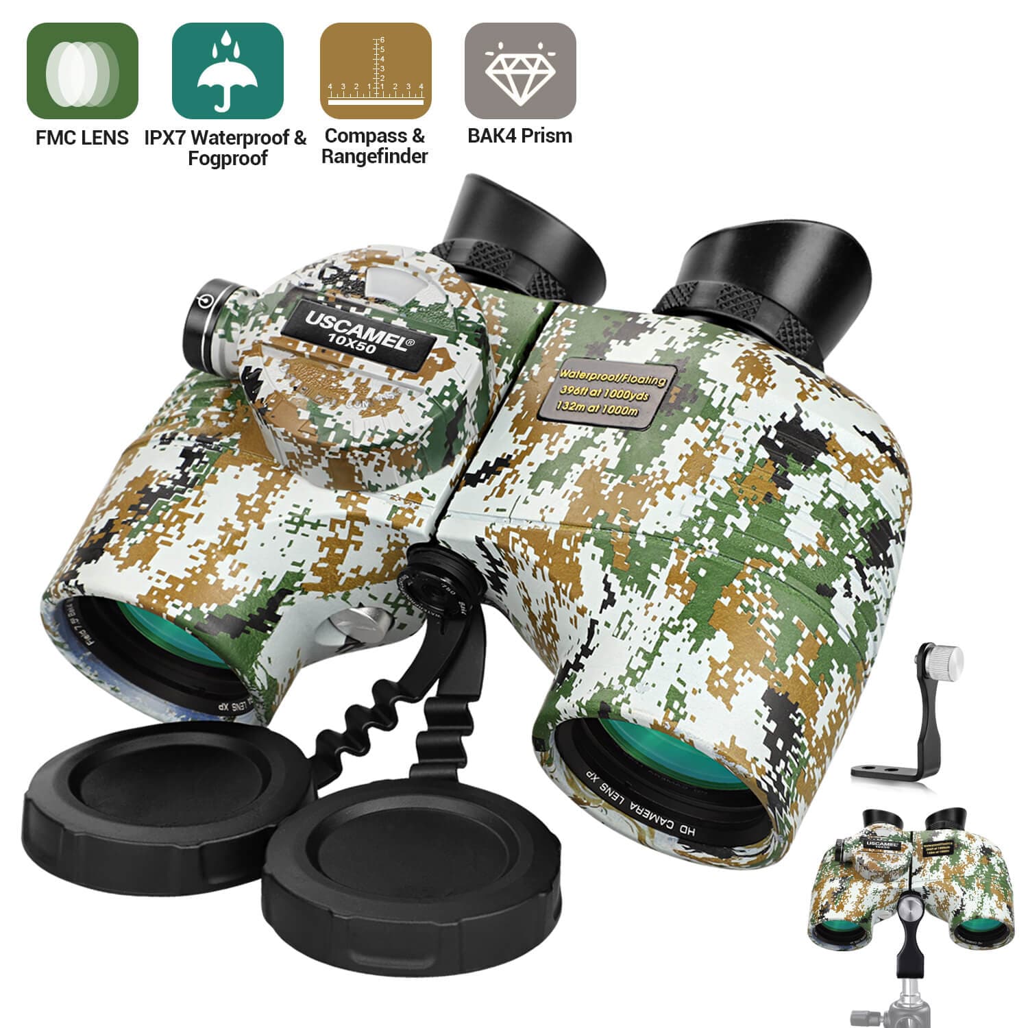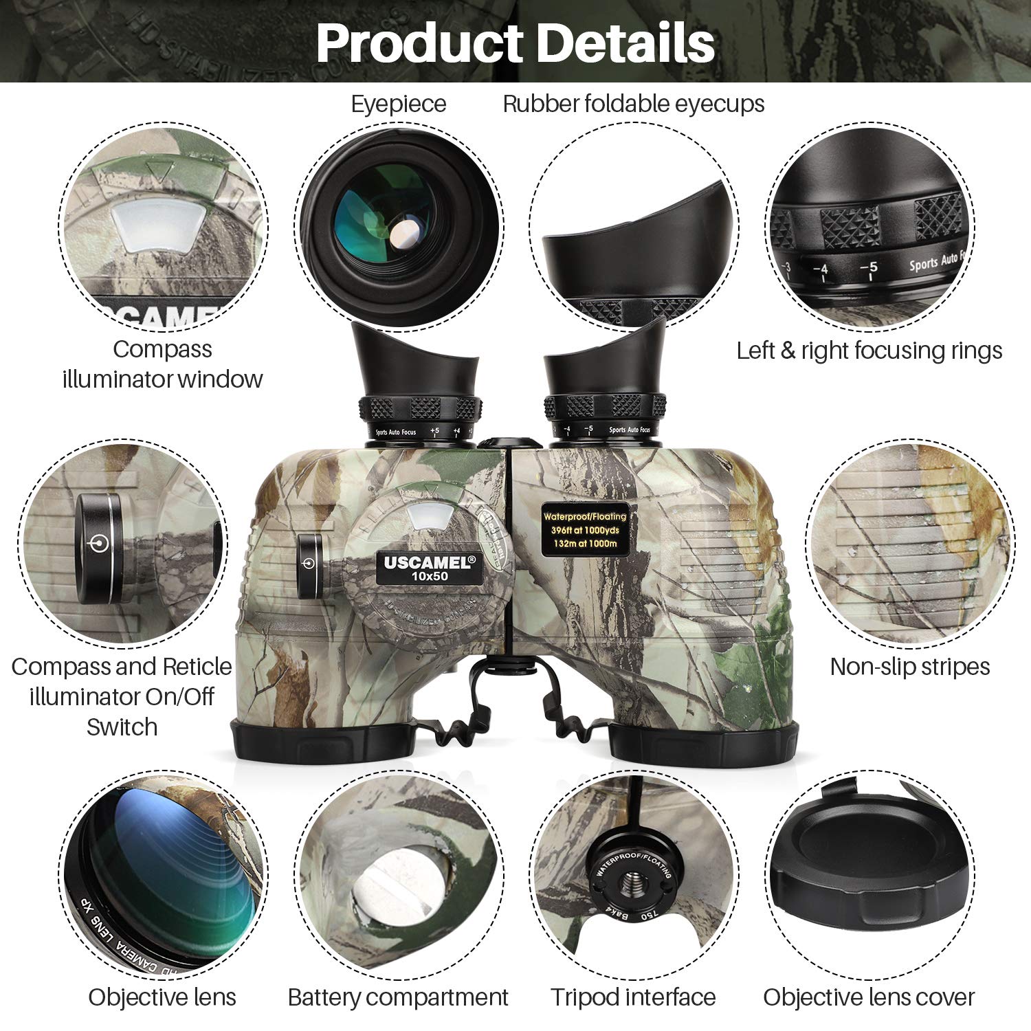 ✓ Marine 10x50 Binoculars. Binoculars with 10x magnification and 50mm large objective lens. The field of view is 396 feet at 1000 yards, with ±5 diopter left and right diopter rings. You can adjust the distance for better viewing without glasses and for fine focusing. The eyecups can be folded easily you can operate them with glasses.