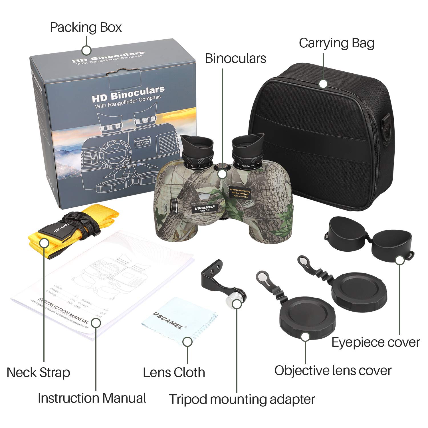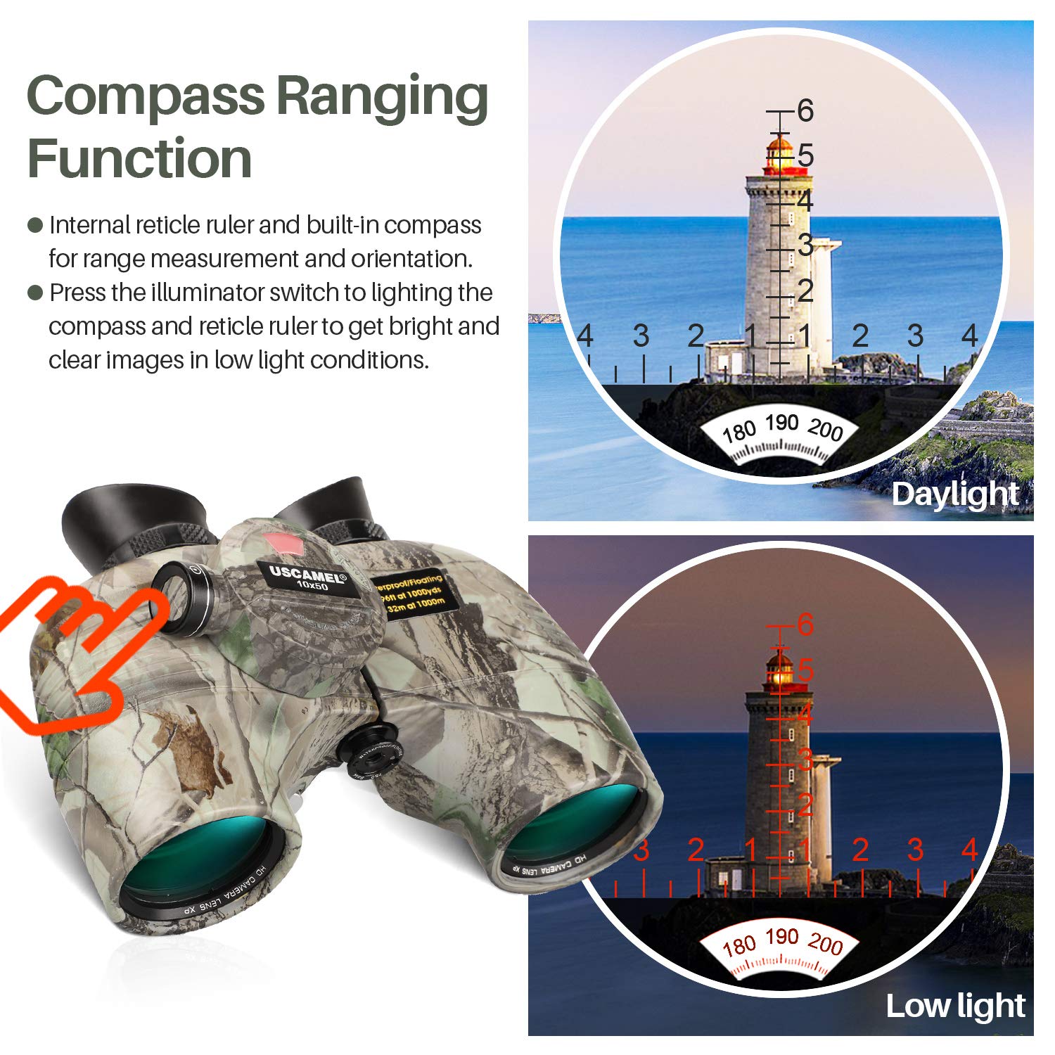 ✓ Binoculars with Rangefinder & Compass. Binoculars illuminated compass built-in for direction location, with an internal rangefinder for calculating the distance and size of the object on the left eyepiece directly. Perfect binoculars include batteries(LR936/AG9), that provide the maximum brightness of the image even in low light conditions.